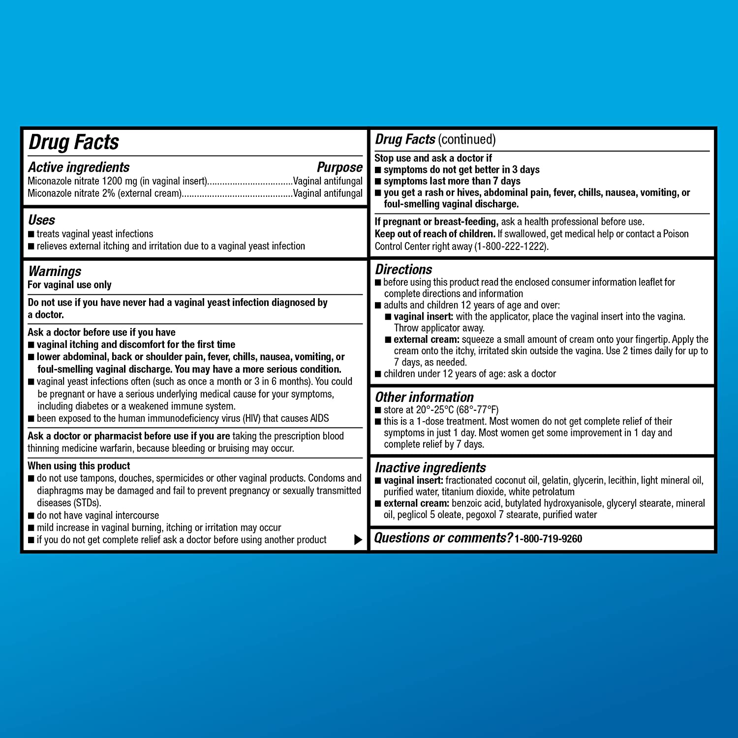 This 1-day treatment plus external cream cures most vaginal yeast infections and relieves associated external itching and irritation. This feminine hygiene product includes one vaginal softgel insert, one comfortable flexible suppository applicator plus external cream for itch relief. Ask a doctor before use if you have vaginal itching and discomfort for the first time. Compare to the active ingredients in Monistat 1 Combination Pack.DIRECTIONS FOR USE: