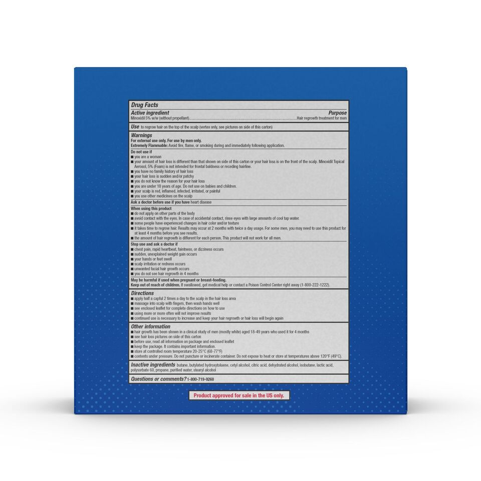 Since normal hair growth is typically about ½ to 1 inch per month, regrowth with Minoxidil Topical Aerosol, 5% takes time. Results may start to appear as early as 2 months with consistent use twice daily, though some men might not see improvements for at least 4 months. If you haven’t noticed any results after 4 months, discontinue use and consult your physician.
