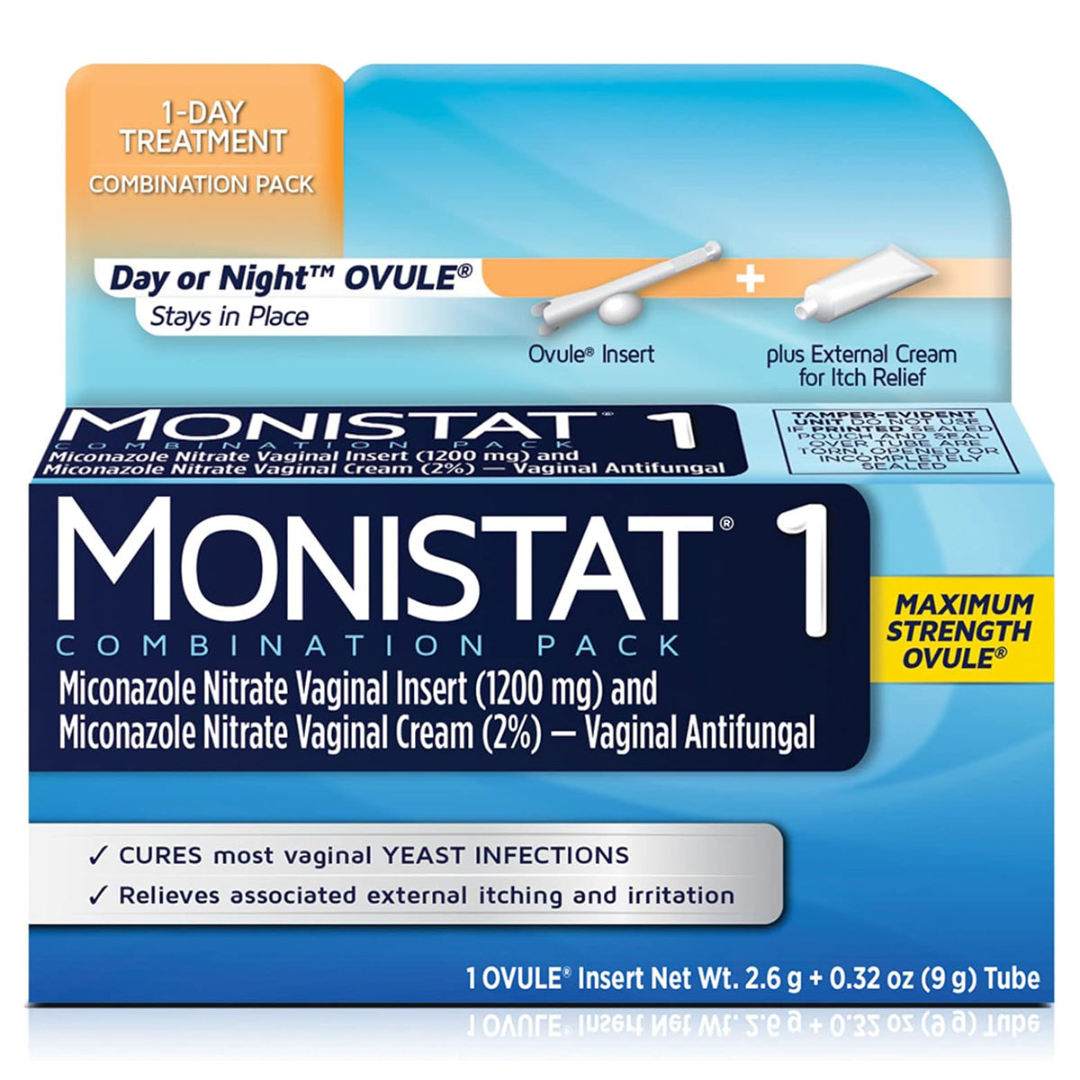 MONISTAT 1 Combination Pack contains a 1-dose OVULE Insert that cures most vaginal yeast infections, plus an external cream that can be used for relief of itching and irritation on the skin outside the vagina (vulva) due to a yeast infection.