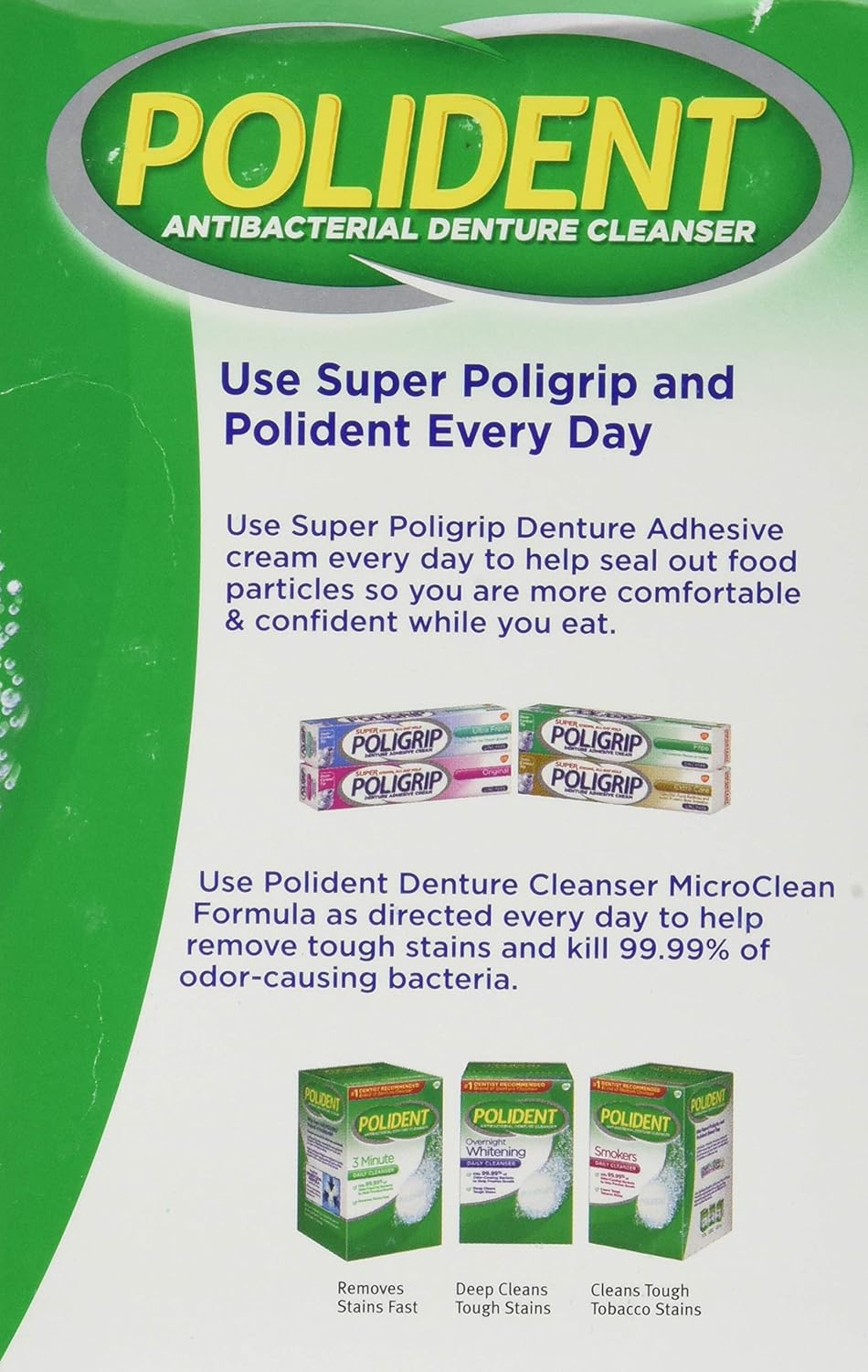 A deep, fresh denture clean has never been easier! Polident Smokers Denture kills 99.99 percent of odor-causing bacteria and viruses and deep cleans to help remove stubborn tobacco stains from dentures. It is also proven to help keep your retainer, aligner or guard crystal clear and transparent, so you can feel confident about your smile all day long.