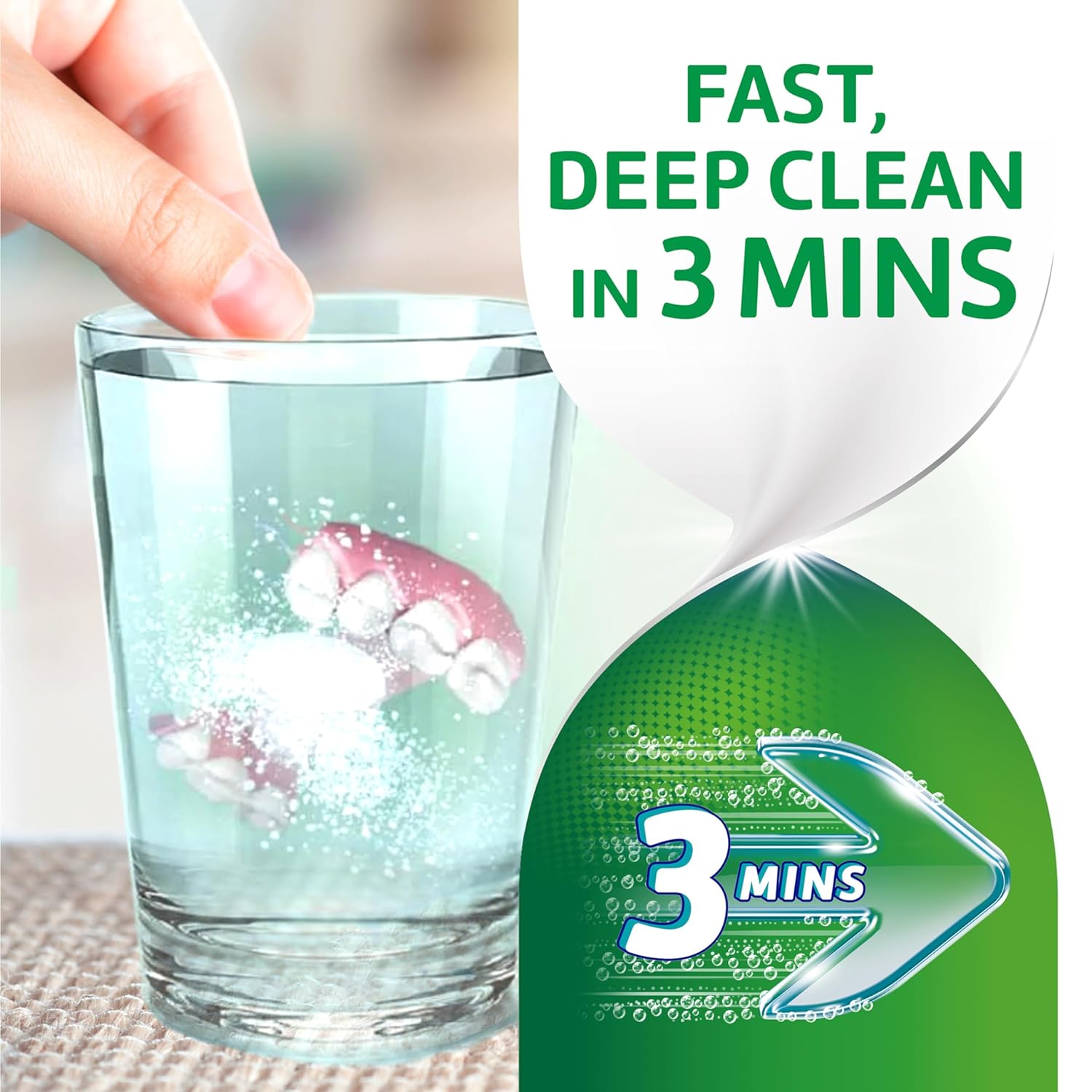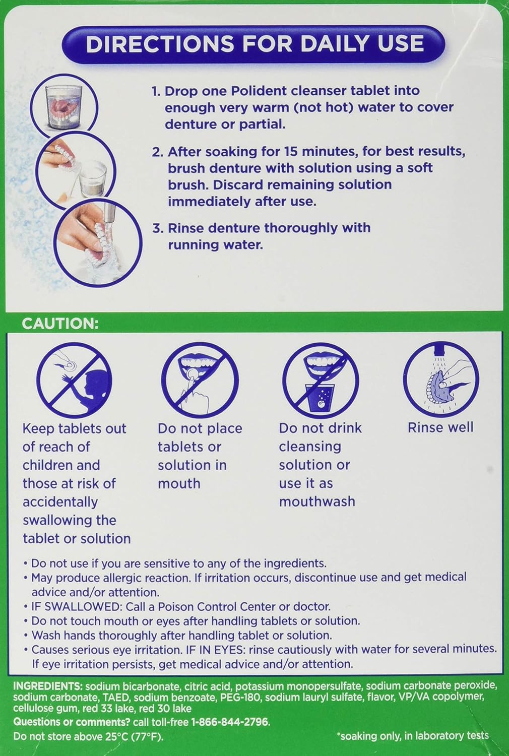 Drop one Polident cleanser tablet into enough very warm (not hot) water to cover denture or partial.